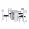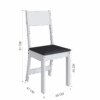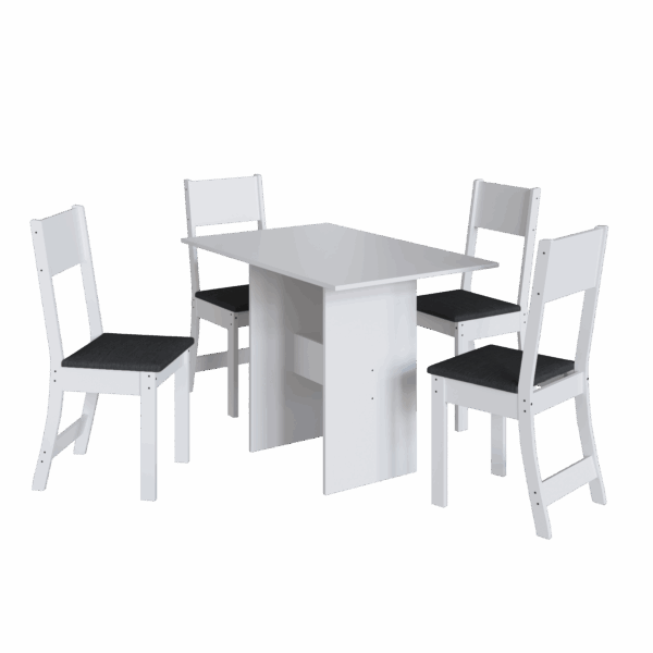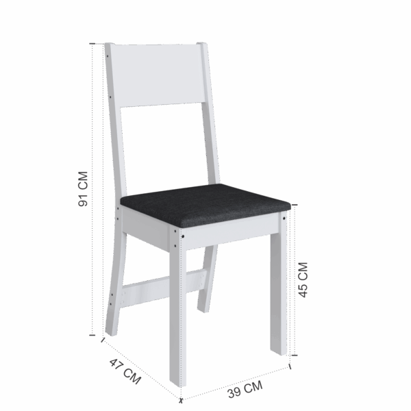 As cadeiras acompanham o conjunto com estrutura resistente e assento estofado em tecido na cor preta, proporcionando mais conforto durante as refeições. O contraste entre a estrutura branca e o assento escuro confere um toque contemporâneo e elegante ao conjunto, além de facilitar a combinação com outros móveis.