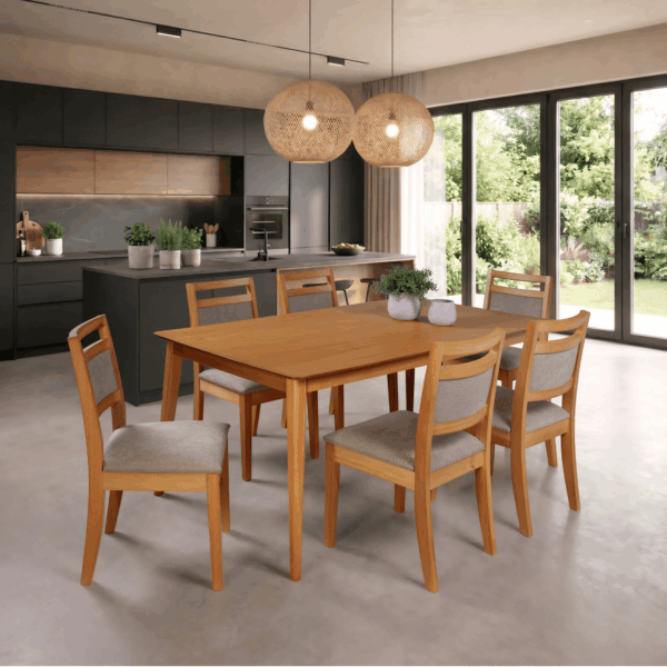 O Mesa Califórnia com Cadeiras Caribe é a escolha ideal para quem busca um ambiente moderno, aconchegante e funcional para a sala de jantar. Com design clean e linhas retas, ele se adapta facilmente a diferentes estilos de decoração.