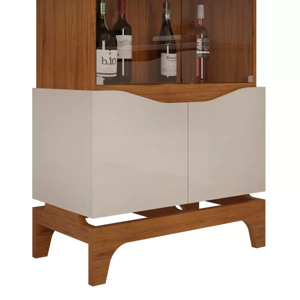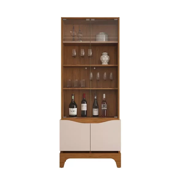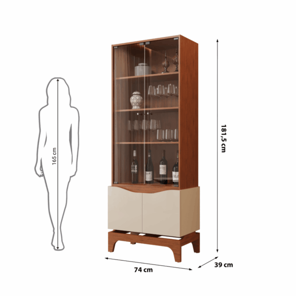 O móvel conta com quatro portas, sendo duas em vidro temperado, que permitem a visualização dos objetos com sofisticação, e duas portas em MDF com detalhes usinados, que agregam personalidade e um acabamento refinado ao design. As três prateleiras internas em MDP oferecem excelente aproveitamento de espaço, facilitando a organização no dia a dia.